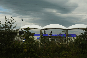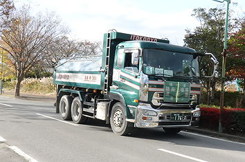 汚染土を運ぶ車両(環境省、除去土壌等運搬の表示)